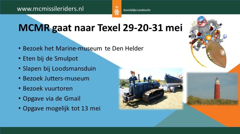 De driedaagse rit gaat dit keer naar het Marine museum, Jutters museum en de vuurtoren. Overnachten in de blokhut Loodsmansduin te Texel.
